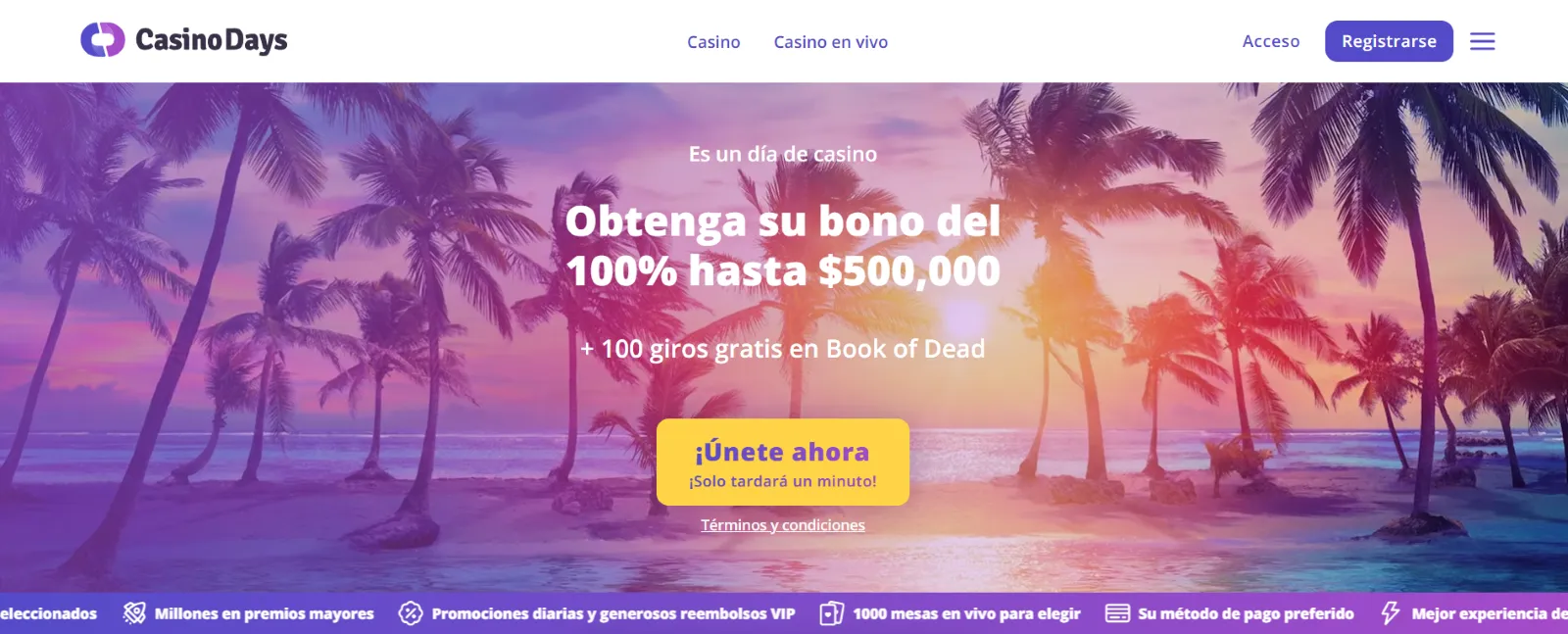 Casino Days, de White Star B.V., es una opción emocionante para jugadores en Chile desde 2020. Durante el último período de trabajo, el operador ha ganado popularidad entre los jugadores de Chile. Cada usuario ha encontrado aquí sus propias ventajas. La característica principal ha sido la variedad de juegos. Ofrecen 1000+ juegos, desde tragamonedas hasta crupier en vivo, para adaptarse a cada preferencia.